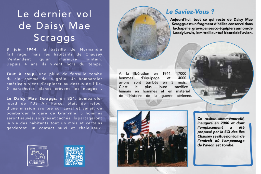Le Daisy Mae Scraggs, un B24 de l’US Air Force, est de retour d’une mission avortée sur Laval. Il vient de bombarder la gare de Granville mais se fait tailler en pièces par des chasseurs allemands. Neuf hommes ont juste le temps de sauter avant l’explosion de leur avion. Cinq seront sauvés, soignés et cachés. Ils partageront la vie des habitants tout un mois et certains garderont un contact suivi et chaleureux.